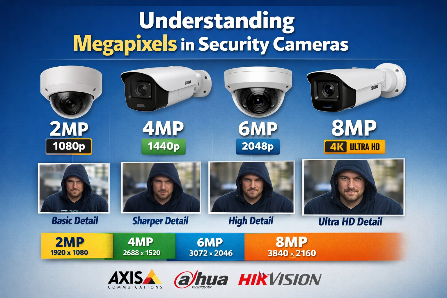Choose 8MP (4K) when the scene is big and you’re prepared to design around bandwidth, lighting, lens choice, and recording capacity.